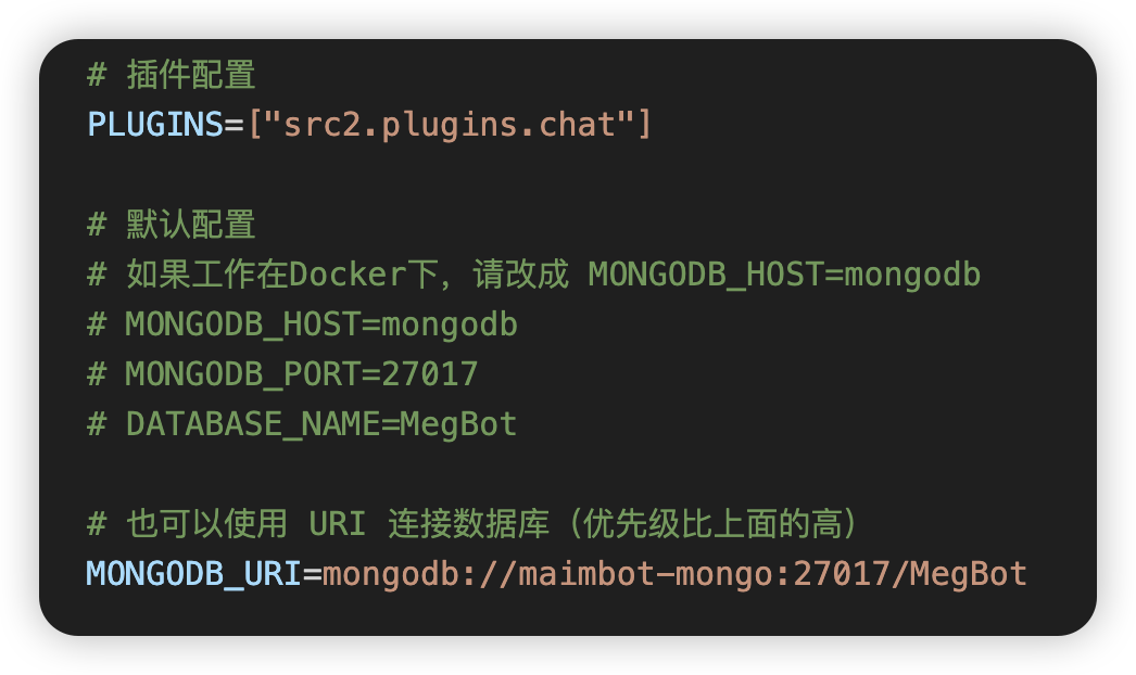 .env.prod: https://github.com/MaiM-with-u/MaiBot/blob/main/template.env 下载后,重命名为 .env.prodHOST 修改为 0.0.0.0,确保 maimbot 能被 napcat 访问 按下图修改 mongodb 设置,使用 MONGODB_URI