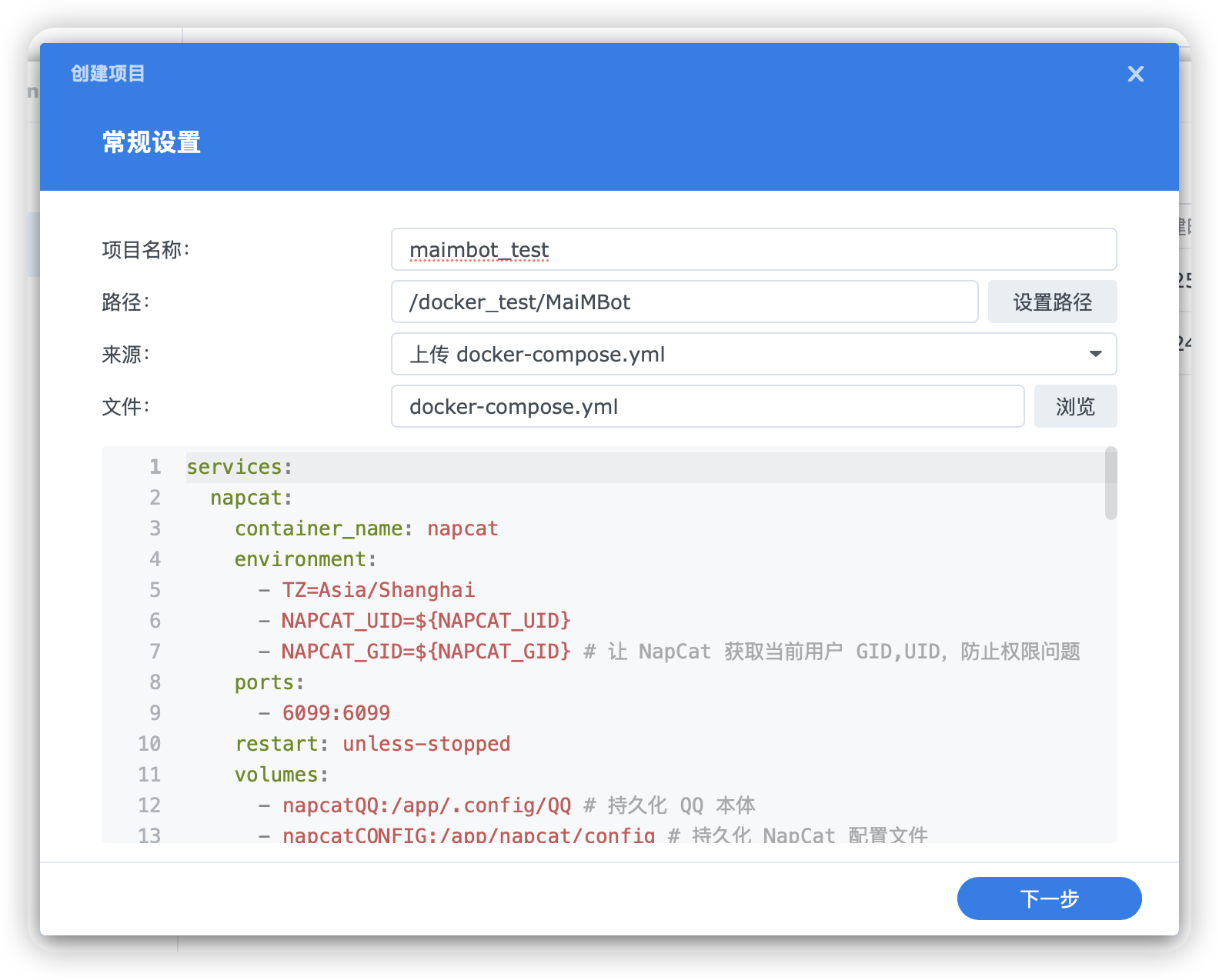 打开 DSM ➡️ ContainerManager ➡️ 项目,点击 新增 创建项目,填写以下内容: