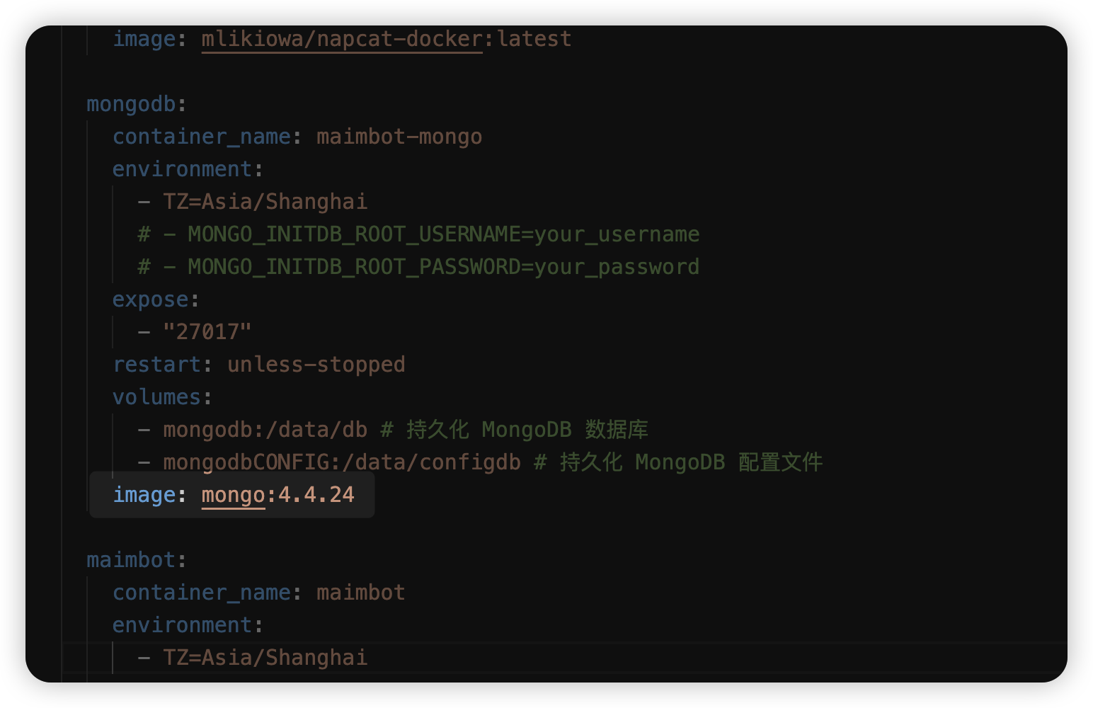 docker-compose.yml: https://github.com/MaiM-with-u/MaiBot/blob/main/docker-compose.yml 下载后打开,将 services-mongodb-image 修改为 mongo:4.4.24。这是因为最新的 MongoDB 强制要求 AVX 指令集,而群晖似乎不支持这个指令集